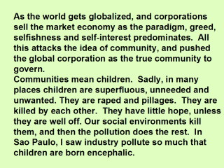 We take away education, which is their and our future. We leave them to learn from peers. They are sold and become prostitutes, and thieves. They indeed are superfluous. Compared to the old in manay countries, they have no advocates, and the old cut budgets such as in the passing of Proposition 13, in California, which locked the property tax used for schools and social services. Their body parts are bought and sold for male transplants. They live in forty-year ghettos in the West Bank, learning only hate, and become fodder for the next life, after using themselves as bombs. They are not their children; They are ours, as well. Yes! They are superfluous. However, for me, they are our future.