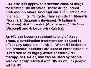 Despite the beneficial effects of HAART, there are side effects associated with the use of antiviral drugs that can be severe. Some of the nucleoside RT inhibitors may cause a decrease of red or white blood cells, especially when taken in the late stages of disease. Some may also cause inflammation of the pancreas and painful nerve damage. Some of the antiretroviral nucleoside analogs when used alone or in combination have caused severe reactions. Therefore, people on antiretroviral therapy should be routinely seen and followed by their health care providers. The most common side effects associated with protease inhibitors include nausea, diarrhea and other gastrointestinal symptoms. In addition, protease inhibitors can interact with other drugs resulting in serious side effects. |