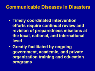 Preparedness Training (relevant to disasters and other complex emergencies): WHO Health Action in Crisis (http://www.who.int/hac/techguidance/training/en) UN Disaster Management Training Program (http://www.undmtp.org/) Academic Centers for PH Preparedness (http://www.asph.org/acphp/index.cfm) CDC PH Training Network (http://www.phppo.cdc.gov/phtn/default.asp) FEMA Education and Training (http://www.fema.gov/tab_education.shtm) DHS National Disaster Medical System (http://ndms.umbc.edu/information.asp) |