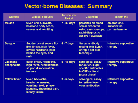 Prevention/Control Measures: Malaria: mosquito control, insecticide-treated nets, bedding, clothing Dengue, JE, Yellow fever: mosquito control. isolation of cases, mass vaccination |