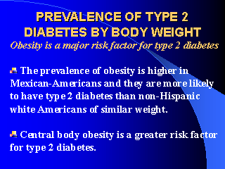 Obesity, like Type 2 diabetes, is an insulin-resistant state and plays an important role in the development of Type 2 diabetes. When a lean individual gains significant body weight, there is a marked decline in insulin sensitivity. However, the beta cell responds to the presence of the insulin resistance by augmenting its secretion of insulin and providing that the beta cell can maintain its high response of insulin secretion, glucose tolerance remains with-in a normal range. Over time (5-10 years) glucose tolerance deteriorates because the insulin resistance cannot be offset by the augmented pancreatic response and overt Type 2 Diabetes Mellitus is manifested. Diet and exercise are the cornerstones of therapy in Type 2 Diabetes Mellitus. No pharmacological intervention will be successful in achieving normal blood glucose levels in the absence of diet and exercise. The obese diabetic who can lose and maintain a 20-30 lb. weight loss will achieve marked improvement in insulin sensitivity and a decrease in mean plasma glucose levels. This is true despite still being well above ideal body weight. Aerobic exercise is best for most patients. The goal is 30 minutes per day of some form of exercise that can be continued indefinitely. Cardiovascular assessment is required prior to starting an exercise program in patients over the age of 40 years |