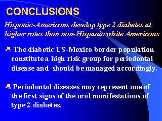 Moreover, the literature suggests that the oral manifestations of Type 2 DM are frequently seen before the actual diagnosis of diabetes occurs as evidenced by the greater number of investigations. Periodontal disease, a major oral manifestation of Type 2 DM, is a progressive, at times painful, and locally destructive disease. Conventional periodontal treatment has proven to have only limited success in controlling this destructive disease. Yet, on the other hand, proper diagnosis and the concomitant appropriate therapy have been shown to be highly effective in controlling not only Type 2 DM but also the oral manifestations of Type 2 DM. Therefore, the early identification of the oral manifestations associated with Type 2 DM, including diabetes, is a particularly important role for the dental public health professional. Clearly, knowledge of the risks factors for periodontitis is critical if the dental public health professional is to focus further preventive and treatment regimens on the Type 2 DM patient population. However, the review of the literature has demonstrate, thus far, that periodontal disease is not a specific disease entity but rather the result of local irritation, inflammation and infection in the presence of decreased systemic resistance and the prevailing opinion is that diabetes is a predisposing factor that reduces the resistance of the periodontal tissues to microbial activity. |