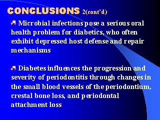 The crevicular space in persons with Type 2 DM can be considered an ideal environment favoring the growth of anaerobic pathogens that have been identified with periodontal disease. The diabetic state is often associated with earlier and severe vascular changes that affect both large and small blood vessels in a variety of tissues, including periodontal tissue. As a result of the vascular changes: the smaller blood vessels are thicker which in turn reduces blood flow; this, then inhibits the diffusion of oxygen as well as obstructs the migration of leukocytes and the diffusion of immune factors to the gingival tissues; hence, creating a more favorable anaerobic environment. Moreover, the periodontal tissues are less able to oxidize glucose and as a result, the crevicular glucose levels are elevated in the Type 2 DM person. These changes would most likely favor the growth of anaerobic pathogens. Investigations of the anaerobic pathogens associated with Type 2 DM demonstrates species of bacteria qualitatively similar to those seen in other forms of periodontal disease. Importantly, however, there is a significant increase in some of the more virulent species such as Bacteroides gingivalis, Bacteroides intermedius, and Wolinella recta. These organisms possess sufficient virulence factors to cause direct tissue damage, especially when they are seen in high numbers. This quantitative increase in virulent organisms, which possess tissue-damaging properties, may be the major factor leading to the increased progression of periodontal disease. Hence, it may then be proposed that the Type 2 DM individual's depressed host defense system allows for a shift in virulence potential of the oral microbes, allowing the overgrowth of specific pathogens during periods when the tissue defense mechanisms have been compromised. Research has shown that patients who have certain systemic medical disorders (e.g., Type 2 DM) that may affect the patients' ability to fight infection are most likely to experience bone and attachment loss. This is particularly true in long-term, poorly controlled diabetic patients. The mineral content of bone has been found to be inversely correlated to the fasting level of blood glucose, glucosuria, and insulin requirements. It has been shown, using experimental diabetic rats, that essentially all aspects of bone growth and mineralization are diminished in the absence of insulin. Although the exact role of insulin in bone metabolism is not fully understood, it appears that a number of factors involved in the metabolism of bone are affected by the insufficiency of insulin. Moreover, patients with a history of bone and attachment loss are at higher risk for further breakdown, and older patients have more attachment loss than younger patients, likely due to the accumulative effects of bone and attachment loss over a lifetime. |