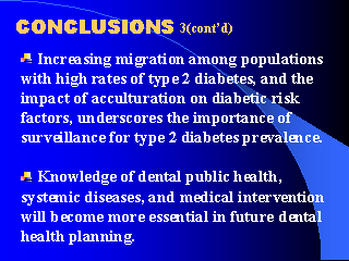 Moreover, diabetes mellitus and in particular Type 2 DM a non-communicable disease, is a major public health problem affecting certain ethnic groups. The prevalence that increases with age is particularly high among women over age 40. A Mexican-American target population along the United States-Mexico border has been presented to assess the oral manifestations of Type 2 DM and to determine the diabetic risk factors affecting the population and which impact on dental public health. This geographic area is home to a high percentage of people of Mexican origin or ancestry. A global overview of the American Southwestern region/border public health issues and concerns has been used to provide the context in which the population lives, and where the disease emerges and is maintained. The specific aim of the lecture/presentation was to examine the oral manifestations of Type 2 DM among older people of Mexican-American ancestry living along the US-Mexico border, particularly in the Texas-Mexico border region, a segment of a population at risk on which this particular aspect of Type 2 DM has not been addressed. The lecture attempted to provide an insight as to the magnitude of the impact of Type2 DM on dental public health as well as contribute further to the understanding of the oral manifestation patterns related to the high prevalence of Type 2 DM in this particular segment of society and the relative role played by different risk factors. In the sections that went before, the lecture discussed/presented in detail the high prevalence of Type 2 DM in the Mexican-American population and the dental public health implications of diabetes that impact on this at-risk and underserved United States-Mexico border population. |