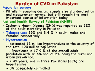 12% of the adult mortality in Pakistan. Hypertension is the most common risk factor of IHD in Pakistan and there were according to NHSP, an estimated 12 million hypertensives in the country of the total 120 million population.49 The prevalence of hypertension (blood pressure¡Ã140\90 mmHg or on anti- hypertensive drugs) was seen in 17.9 % of the overall adult population with 16.4% and 21.5% being the rural and urban prevalence respectively. Above the age of 45 years, one in three Pakistanis (33%) was hypertensive and overall, only 3% of the hypertensives were adequately controlled. Furthermore 85% of hypertensives in rural areas were unaware of their hypertension. |