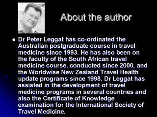 His qualifications include: MD (higher doctorate in medicine), University of Queensland, Australia PhD (in occupational health), University of South Australia DrPH (in travel medicine), James Cook University, Australia Dr Leggat is a specialist in public health medicine and holds Fellowship of several professional organisations. He is a former Fulbright Scholar and also the recipient of the Surgeon General’s Medal (Australia) in 2002. He has been a Board Member for the International Society of Travel Medicine (2003-2005), the World Safety Organization (1989-1999, 2003-2005; incl. Director-General 1997-1999), and the Australasian College of Tropical Medicine (1991-Present; incl. President 1996-1998, 2002-2004). |