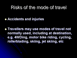 Accidents and injuries may also befall travellers, who may use modes of travel not normally used or undertake activities that they are not used to. This may occur either at their destination or in transit to their destination, eg hiring four wheel drives without prior training, unsafe low cost motor vehicles, motorbike riding or bicycle riding without helmets, roller-blading, skiing and use of unscheduled aircraft or ferries. Accidents will occur commonly, especially in countries where accidents are common.