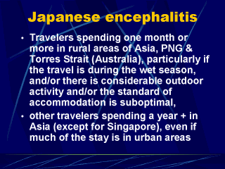 | These are the Australian guidelines for Japanese encephalitis vaccination. More information can be found at: http://www.health.gov.au/pubhlth/immunise/index.htm or in your national guidelines. Japanese encephalitis currently requires a schedule of three vaccinations. |