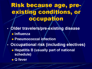 | Older travelers (65 years and over) may be considered for influenza and pneumococcal vaccination according to national guidelines. Increasingly, hepatitis B vaccination is becoming part of the national immunization in many countries. Occasionally, occupational vaccinations may need to be considered, such as Q fever, where people are going to work on farms or meat processing areas of endemic areas. |