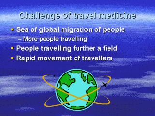 | There are a lot of people traveling. There are more and more people traveling; they are traveling further a field; and travelers can move rapidly from one part of the world to another. |