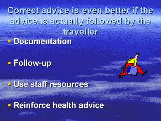| Health and safety advice needs to be reinforced with travelers. Various staff and resources may be employed to follow-up and reinforce travel health advice. |