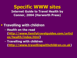 before travel or consulted by the travel health advisor. There are taken from the recently published Internet Guide to Travel Health by Connor, 2004 (Harworth Press) |