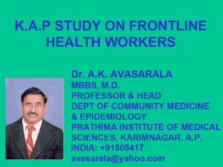 divisional secondary care hospitals Then completed post graduation in public health medicine/preventive & social medicine & epidemiology and teaching medical graduates and post graduates, nursing students, physiotherapy students, primary care personnel for the last 15 years. At present working as Professor & Head of the department of Community medicine & Epidemiology since 15 years and practicing and contributing to the cause of epidemiological spread and growth in India (life ambition) as Indian super course epidemiology developer. Other 6 supercourse lectures of mine can be accessed at www.pitt.edu/~super1/faculty/lecturers.htm |