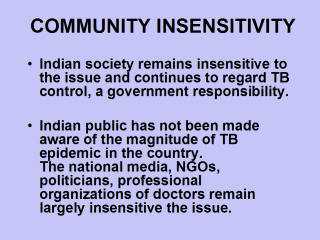 COMMUNITY - PARTICIPATION IN TB CONTROL "TB control is not a public movement in India even 18 months after the Amsterdam Declaration. Tuberculosis control has not emerged as a major issue in India at community or personal levels. It still remains an "official programme" Dr. Dinesh Kumar, Director, Health and Development Initiative-India. Email: dinesh_kumar@vsnl.com |
