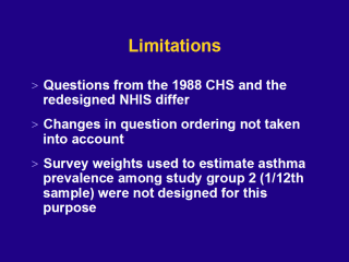estimates is likely to be conservative. Second, the NHIS questionnaire was completely redesigned in 1997, including structure and order of the questions. We were not able to estimate the impact of these changes. Third, it was necessary to use the survey weights from 1988 to estimate national prevalence for study group 2 (the 1/12 sample). However, the weights were not designed to be used in this way, and bias may have been introduced into our analysis. Despite the limitations, examining responses for the 1988 NHIS child participants shows that the redesigned NHIS is capturing a different aspect of asthma and therefore produces lower estimates than the previous questionnaire for a given "background" asthma prevalence in the population. Directly comparing pre- and post-redesign estimates without taking the impact of the redesign into account will lead to an erroneous conclusion that childhood asthma prevalence has recently declined. When the change in the questions used to estimate asthma prevalence is taken into account, asthma prevalence in 1997-2000 appears to have remained at mid-1990s levels. |