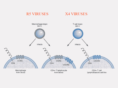 HIV infects cells that carry the receptor and co-receptor CD4 Expressed on the surface of CD4 T lymphocytes (helper T lymphocytes) and macrophages (including dendriticcells) CCR5 Expressed on CD4+ T lymphocytes and on macrophages CXCR4 Expressed on CD4+ T lymphocytes and T cell lines |