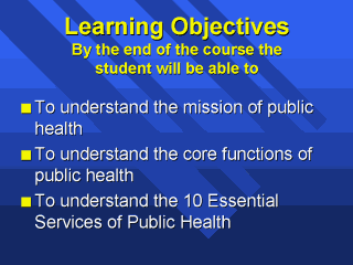 | The learning objectives of this lecture are that you will understand the mission of public health, core functions of public health and Ten Essential Services of Public Health |
