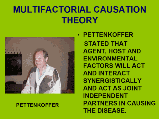 EXPLAIN THE NON COMMUNICABLE DISEASE CAUSATION WHERE ONE CANNOT FIND A GERM. HE GAVE GENERALIZED EXPLANATION APPLICABLE TO ALL DISEASES, INFECTIOUS AND NON-INFECTIOUS AS WELL THAT DISEASE IS MULTIFACTORIAL. PETTENKOFFER CONTRADICTED THE UNIFACTORIAL THEORY OF DISEASE CAUSATION AND EMPHASIZED THAT DISEASE IS MULTIFACTORIAL IN CAUSATION. SEVERAL CAUSES OR FACTORS ACTING JOINTLY, CUMULATIVELY, BY COMPLEMENTING OR IN AN UNEXPLAINED MANNER WILL LEAD TO THE DISEASE.THIS THEORY OF WEB OF CAUSATION EXPLAINS BOTH THE INFECTIOUS AND NON-INFECTIOUS DISEASES. THESE MULTIPLE CAUSES WORK THROUGH DIFFERENT GROUPS OR CONSTELLATIONS. |
