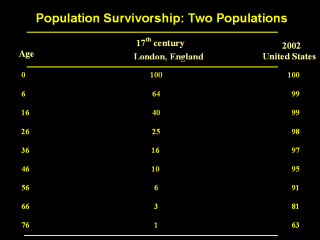 stock-in-trade for actuaries charged with computing life insurance premiums. John Graunt produced the first life table, albeit a very primitive one. His table didn’t give us life expectancies, but it did show another important life table function; namely, survival, the probability, for example, that a newborn would survive to age one. Seventeenth century London occupied the first stage of the demographic transition, and Graunt’s life table showed that 36% of newborns were projected to perish by six years of age. By contrast, less than 1% of newborns in the United States today would be projected to be dead by age 6. We have come a long way indeed. Sources: Arias, E. United States Life Tables, 2002. National Vital Statistics Reports; 53(6). Hyattsville, MD: National Center for Health Statistics. 2004. Graunt, J. Natural and Political Observations Mentioned in a Following Index and Made upon the Bills of Mortality, in William Petty, The Economic Writings of Sir W. Petty. Vol. 2, ed. C.H. Hull (New York: Augustus M. Kelley, 1964). |