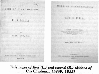 | While the end of the cholera outbreak closely followed the removal of the pump handle, Snow did not blindly assume cause and effect. He confirmed his water-cholera hypothesis in an analytic study that was published in 1855 as a book entitled On the Mode of the Transmission of Cholera. It is this analytic research, and his substantiated belief that cholera was a contagious disease, that elevated him to an icon among contemporary epidemiologists. |
