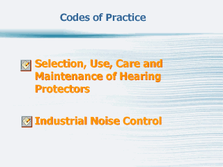 professionals and the academia. The Codes include: The Code of Practice for Selection, Use, Care and Maintenance of Hearing Protectors7, 1999: provides information and guidance to persons who supply, purchase or wear hearing protectors, and sets criteria and standards on their selection, care and maintenance. The Code of Practice for Industrial Noise Control8, 2002: provides detailed technical information on noise and vibration control for acoustic specialists, plant engineers, safety and health professionals, technical personnel and those who wish to apply practical measures to control noise and vibration, as well as guidance on planning for noise control at the plant design stage. It stipulates the roles and responsibilities of factory occupiers and appointed competent persons with respect to noise monitoring, noise control planning and noise hazard management. The Code includes worked examples on engineering noise control such as the use of acoustic barriers, enclosures, partition walls, silencers, isolators, sound absorbing and damping materials. 7. Code of Practice for Selection, Use, Care and Maintenance of Hearing Protectors. Singapore Productivity and Standards Board, 1999. 8. Code of Practice for Industrial Noise Control. Singapore Productivity and Standards Board. Singapore Productivity and Standards Board, 2002. |