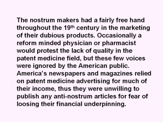| Even the AMA throughout the last half of the 19th century, though concerned with the public health threat posed by the wide spread use of patent medicines, was unable to even stop the marketing of these nostrums in medical journals. Out of some 250 medical journals in 1905 only a few refused to accept patent medicine ads. Obviously if the medical profession could not clean up its own journals there was no way it could call on the popular press to reject this type of advertising. |