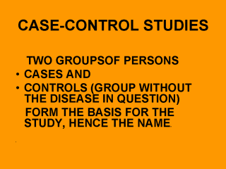 | Case control design is also called as retrospective or backward looking study as the study commences with the cases in which disease in question had already appeared. |