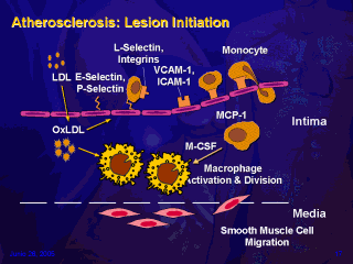 OxLDL also augments expression of monocyte chemoattractant protein 1 (MCP-1) and macrophage colony stimulating factor (M-CSF). MCP-1 mediates the attraction of monocytes and leukocytes and their diapedesis through the endothelium into the intima. M-CSF plays an important role in the transformation of monocytes to macrophage foam cells. Macrophages express scavenger receptors and take up and internalize oxLDL in their transformation into foam cells. Migration of smooth muscle cells (SMCs) from the intima into the media is another early event initiating a sequence that leads to formation of a fibrous atheroma. Kinlay et al. J Cardiovasc Pharmacol. 1998;32(suppl 3)S62-S66.