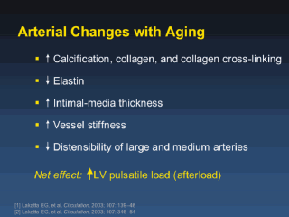 ventricular (LV) pulsatile load with age. Thus, the older adult heart requires greater LV stroke work, wall tension and myocardial oxygen consumption during systole than does the younger heart, thereby increasing the risk of ischemia, even in the absence of CAD. In addition, vascular wall stress is increased, predisposing to vascular injury, an important stimulus to the development and progression of atherosclerosis. [1] Lakatta EG, et al. Arterial and cardiac aging: major shareholders in cardiovascular disease enterprises – part I: aging arteries: a “set up” for vascular disease. Circulation. 2003; 107:139–146 [2] Lakatta EG, et al. Arterial and cardiac aging: major shareholders in cardiovascular disease enterprises – part II: the aging heart in health: links to heart disease. Circulation. 2003; 107:346–354 |