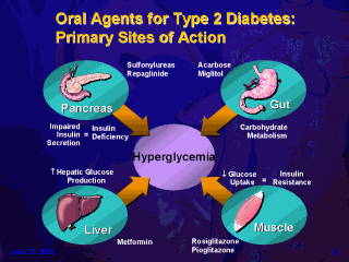 production. Acarbose and miglitol decrease glucose absorption from the gut. However, the preceding studies (id, UKPDS 16 and Weyer C, et al, 1999) highlight the importance of beta-cell dysfunction in type 2 diabetes. Beta-cell dysfunction needs to be addressed with insulin secretagogues or insulin. This is one reason why sulfonylureas have long been a mainstay of antidiabetes therapy, since these agents enhance insulin secretion. UK Prospective Diabetes Study Group. UK Prospective Diabetes Study 16. Overview of 6 years’ therapy of type II diabetes: a prospective disease. Diabetes. 1995;44:1249-1258. Weyer C, Bogardus C, Mott DM, Pratley RE. The natural history of insulin secretory dysfunction and insulin resistance in the pathogenesis of type 2 diabetes mellitus. J Clin Invest. 1999;104:787-794. DeFronzo RA. Pharmacologic therapy for type 2 diabetes mellitus. Ann Intern Med. 1999;131:281-303. |