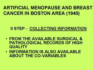 FOLLOW-UP For 21-42 years, cohorts were followed through various sources like health records, death certificates and tumor registry. IV STEP: ANALYSIS Incidence is measured directly from the number of new cases occurred out of the total number in the cohort. Risk is measured by calculating Relative risk, cumulative risk, estimated cumulative risk and aetiological fraction. |