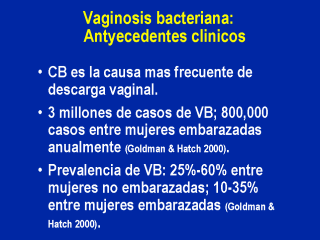 prevalente en USA y en el mundo. 2. Aunque no es una condicion reportable, hay 3 millones de casos diagnosticados en USA anualmente. Aunque las mujeres con VB presentan secrecion transvaginal olorosa o sangrado vaginal anormal,aproximadamente la mitad de los casos son asintomaticos y el numero anual puede exceder los 6 milloes. Elevada proporcion de VB entre mujeres que asisten a clinicas de ETS, mujeres con bajos ingresos y urbanas, necesitan estar concientes de la poblacion en estudio cuando se interpreten las tasas de VB |