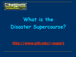 More than 2000 cutting edge lectures from leading scientists including 6 noble prize winner. The mission is to provide for free the best possible education materials on health, here it is applied to Hurricane disaster. For more information, please view the following lectures: Introduction to the Supercourse. By Ronald LaPorte http://www.pitt.edu/~super1/lecture/lec0012/index.htm Supercourse overview. By the Supercourse team http://www.pitt.edu/~super1/lecture/lec6961/index.htm Turning the Alley of Information Exchange in Developing Countries to the Super Highway. By: Ali Ardalan http://www.pitt.edu/~super1/lecture/lec16681/index.htm |