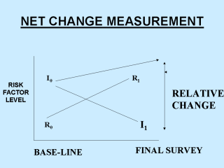 of Net change measurement: Net change = percentage of change in the intervention community minus percentage of change in the reference community Io = Initial value of the outcome in intervention community I1= Final value of the outcome in intervention community R0 = Initial value of the outcome in the reference community R1 = Final value of the outcome in the reference community FORMULAE a) {(I1 – I0) / I0} - {(R1 – R0) / R0} = ( I1 / I0) - ( R1 / R0) b) {(I1 – R0) / I0 X R1} – 1 (Direct confidence interval estimations). c) {(I1 – I0 – R1) / R0 } + 1 (When reference population is considered as base level) |