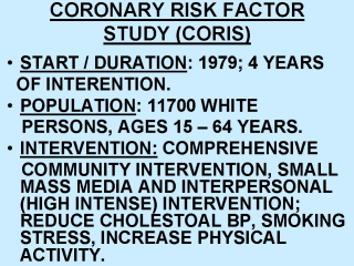 ONE REFERENCE GROUP. EVALUATION:INDEPENDENT ANDCOHORT SAMPLES BEFORE AND AFTER INTERVENTION, SURVEYS AT 4 YEAR INTERVALS PLANNED.. RESULTS: LOW INTENSITY INTERVENTION ACHIEVES AS MUCH REDUCTION OF RISK FACTORS AS HIGH INTENSITY, MORTALLY EVALUATION PENDING. (ROOSOUW ET. AL. 1993) |