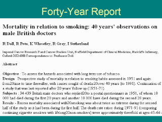 prematurely. “Results from the first 20 years of this study, and of other studies at that time, substantially underestimated the hazards of long term use of tobacco. It now seems that about half of all regular cigarette smokers will eventually be killed by their habit.” “Even in middle age stopping smoking substantially increased the subsequent expectation of life - and those who stopped before 35 years of age had an expectation of life that was not significantly different from that of non-smokers.” |