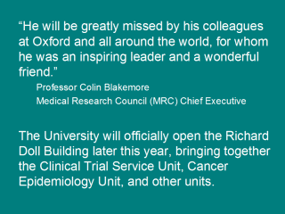 the Clinical Trial Service Unit, Cancer Epidemiology Unit, and other units. “Sir Richard will be remembered as an inspiration and mentor to generations of scientists, a community in which he loved to spend his time long into what for most of us would have been retirement. It is fitting therefore that the University will shortly be opening the Richard Doll Building, where work on population studies, influenced by his visionary approach to the discipline, will continue to establish reliable assessments of the causes, prevention and treatment of cancers, heart attacks, strokes and other major diseases.” Dr John Hood, Vice-Chancellor of the University of Oxford |