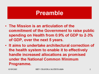 | Government of India launced the National Rural Health Mission in April 2005. Political commitment of the missionary approach is reflected in its launch by the Prime Minister of the country. Eighteen of the 35 states of the federal republic of India are following the suit by creating state level missions under the chair of respective Chief Ministers of the states. Geographically these are northern and eastern states of the country which have more challenges on human development front. |
