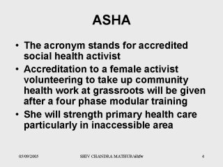 | ASHA is a refined version of community health worker schme which country undertook for a spell of two to five years about 25 yeaars back. The weaknesses and failure encountered in earlier projects have been seriously considered in formulating the current scheme. |