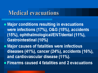 | Most of the conditions requiring aeromedical evacuation were not surprising, however cancer, accounting for nearly one quarter of evacuations, was an unexpected cause. Most fatalities were due to infectious disease cancer and accidents. Firearms were the cause of only a small number of fatalities and evacuations. |