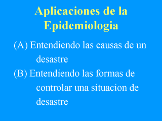 caracteristicas de los desastres desde una perspectiva epidemiologica. La investigacion epidemiologica de los desastres se enfoca en dos formas: la primera es el estudio epidemiologico tipico de las causas subyacentes al desastre; enfocandose en el evento mismo, o en la morbi-mortalidad asociada con el evento. Aprendiendo tanto como sea posible de las razones de los desastres es importante para el desarrollo de actividades preventivas en el futuro. La segunda forma es usar los metodos epidemiologicos para investigar mecanismos para aliviar la carga de los desastres, una vez que ocurren. Esto puede aplicarse a la preparacion de desastres o la mejoria de los efectos del desastre. La mas directa aplicacion de la epidemiologis en esta situacion es el establecimiento de sistemas de monitoreo para identificar danos y el posible surgimiento de enfermedades infecciosas. |