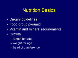 Guidelines: designed for healthy people living in the United States. Food Group Pyramid: a healthy guideline for selecting daily food choices established for healthy people over 2 years of age. The modified pyramid is for children under 2 years of age. Vitamin and mineral requirements RDA - see charts supplements maybe required for children with special needs Go to Part III of this lecture