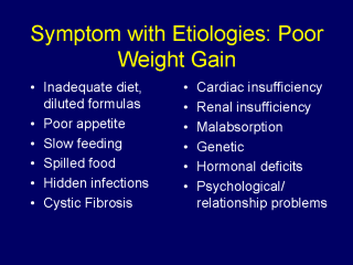 Children (WIC); family lacks appropriate health care. Poor Appetite: Gastroesophogal Reflex (GER), medications, acute illness, etc. Slow feeding: motility problems should be explored. Cystic Fibrosis (CF): consistent with history of diarrhea, chronic Upper Respiratory Infection (URI). Hormonal Deficits: hypothyroidism, growth hormone deficiency. Psychological/Relationship Problems: disorganized parenting, rigid parenting Malabsorption: diarrhea, abdominal distention. Renal Insufficiency: history of renal disease, polyuria, oliguria . |