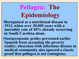 Health, 2000). As early as 1900 (Roe, 1973), British epidemiologist Fleming Sandwith suggested that the leprosy-like pellagra was associated with a diet of bad maize. Although this point was shared by Casal more than a century ago (the first reporter of pellagra, see Slide 6), political and economic prides prevented Spanish people from accepting the reality that they were facing a problem of poverty. Upon receiving his assignment from the U.S. Surgeon General, Goldberger’s first step was to travel through the South to observe the epidemic. In 1913, Goldberger conducted an experiment on a number of Mississippi inmates who volunteered for the study in exchange for a pardon. The experiment involved the use of different diets, including the poor Southern diet that Goldberger had suspected to be associated with pellagra. When the volunteers came down with pellagra from eating the poor corn diet, the researcher and his co-workers tried hard to deliberately catch the disease from these victims but without success. In spite of the fact that this classic evidence showing pellagra to be noncommunicable, Goldberger found it difficult to convince the medical community who at the time had an obsession with infectious disease. |