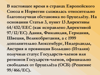 | В соответствии с Решением 66/94/COL Норвегия также достигла статуса ОСБ. В большинстве неОСБ стран (Франция, Греция, Ирландия, Италия, Португалия и Испания) в 1999 г. (Решение 98/703/EC) были реализованы программы по ликвидации бруцеллёза бычьего типа, одобренные для общественного финансирования, которые были продолжены в 2000 г. (Решение 2000/5/EC). |