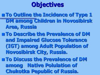 Center of Endocrinology «Sibdiab» and Institute of Internal Medicine are involved into several epidemiological studies of DM in Siberia. All of these studies are well standardized: The study of Incidence of DM among children is a part of WHO DIAMOND Program, the study of the prevalence of DM (age group 25-64 years) was a part of population screening according to WHO MONICA Program and Study among native population of Chukotka was conducted according to joint protocol of investigation among the University of Manitoba(Canada) and Institute of Internal Medicine and was a part of Alaska-Siberia medical research Program.