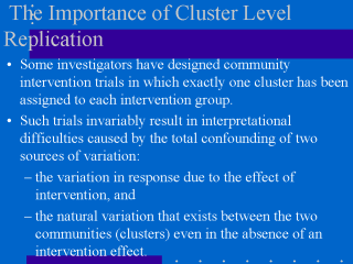 Analysis is only possible under the untenable assumption that there is no clustering of individuals responses within communities.More attention to the effects of clustering when determining sample size might help to eliminate designs which lack replication.