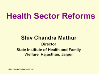 with particular reference to India. Viewers/Readers are welcome to share their observations/comments with author at shiv_mathur@hotmail.com They may go through other lectures from the author in supercourse series on RCH, adolescent health, population policy, NRHM and violence against women in India www.pitt.edu/~super1 (through topic, keywords, lecturers.... pages) The current lecture is addressed to health professionals of India in particular, large number of whom in different states of India are involved in introducing and implementing health sector reforms in the public systems. |