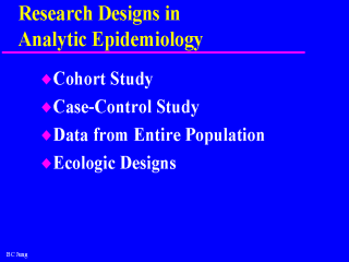 more common study designs in Epidemiology include: Cohort Study - gold standard when exploring the association between a risk factor or participation in a health program, and health status outcomes or health events. Case-Control Study - more commonly used, less expensive, when outcome of interest is rare, and a random sample from a population would yield too few cases. Involves a retrospective assessment of differential exposure between 2 comparison groups. Data from Entire Population - considered cross-sectional since collection or sampling of the exposure and outcome info is at the same point in time. Considered prevalence data. A relationship between exposure and outcome is the ratio of 2 prevalence rates, or relative prevalences. Ecologic Designs - Data for exposure and disease are used in aggregated form and cannot be linked at the individual level. |