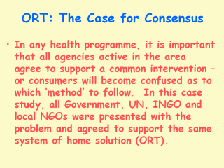 the six or seven active agencies used different home solution systems. UNICEF played a coordinating role is bringing all agencies together (both provincial and refugee); demonstrating what was happening; getting agreement to act together; and defining how to proceed. Two different systems of preparing the home solution were proposed for test (spoon and glass; and pinch-and-scoop). While the spoon and glass method appeared to be better comprehended by communities, both spoon and glass sizes varied so much that the range in resulting solute concentrations were well outside the WHO defined limits. The pinch-and-scoop method gave a far more reliable solute concentration (within the WHO limits), so it was decided amongst the agencies to support this method only. The coordinated approach was made easier because UNICEF undertook to provide all resulting materials free to all agencies in whatever numbers could be justified, when the development was completed. |
